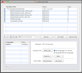 ちなみに、下に元の文字列に近い候補が出たりします。このスクリーンショットではiPhoneとiPadのxibで同じ文字列があるので表示されています。Localization Managerのファイル(.ldb)とLocalizerのファイル(.loc)は完全に独立しているようなので、書き戻す必要があります。Localization Managerに戻り、[Edit...]の左の[Read In...]をクリックすると.ldbに書き戻されます。